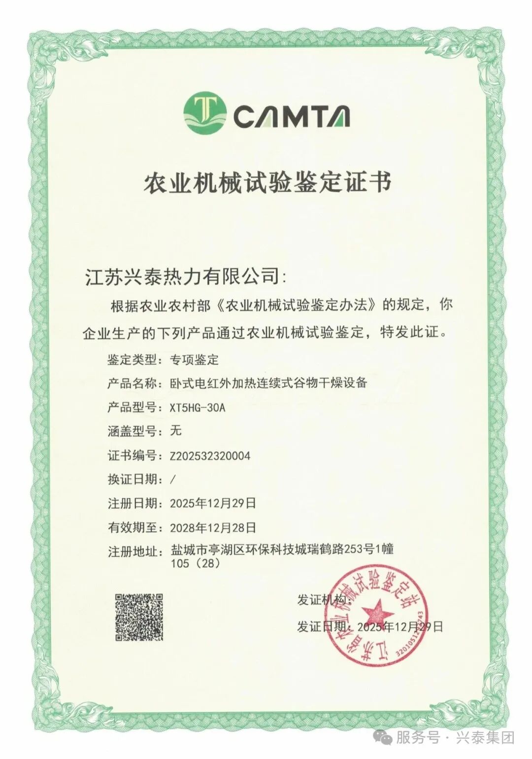 近日,兴泰集团旗下江苏兴泰热力有限公司自主研发、生产的 “卧式电红外加热连续式谷物干燥设备” ,凭借其创新的设计理念、先进的技术工艺与卓越的性能表现,顺利通过 江苏省农业机械试验鉴定站 的严格检测与专项鉴定,荣获专项鉴定证书。这一认证标志着兴泰集团在农业机械领域的技术创新与产品质量达到国家权威标准,为产品市场推广和政策支持提供了坚实保障。